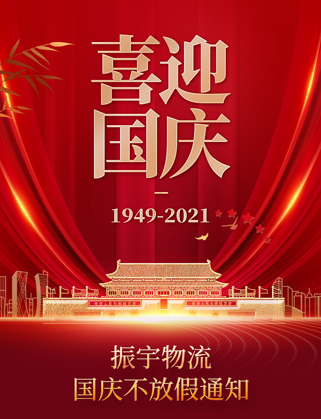 您好!正值秋高氣爽天,恰逢稻熟豐登日,祖國母親即将迎來72周年華誕。五星紅旗迎風飄揚 ,我們同慶祖國華誕的榮光!振宇物流爲瞭(le)給您提供更好的服務 ,並(bìng)結合我司實際情況,現對國慶假日期間做出如下工作安排 :