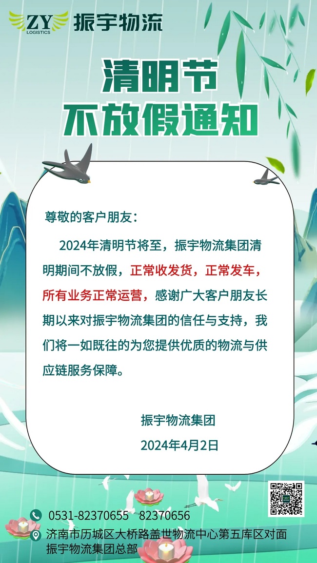2024年清明節将至,振宇物流集團清明期間不放假,正常收發貨,正常發車,所有業務正常運營,感謝廣大客戶朋友長期以來對振宇物流集團的信任與支持,我們将一如既往的爲您提供優質的物流與供應鏈服務保障。