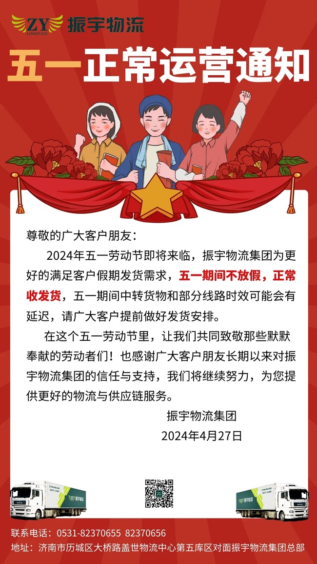 2024年五一勞動節即将來臨,振宇物流集團爲更好的滿足客戶假期發貨需求,五一期間不放假,正常收發貨,五一期間中轉貨物和部分線路時效可能會有延遲,請廣大客戶提前做好發貨安排。