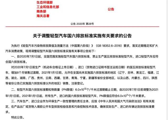 同時,公告表示,輕型汽車國六排放标準顆粒物數量(PN限值)6.0×1012個/千米過渡期截止日期由2020年7月1日前調整爲2021年1月1日前。2021年1月1日起,所有生産、進口的國六排放标準輕型汽車,PN限值應符合6.0×1011個/千米要求。