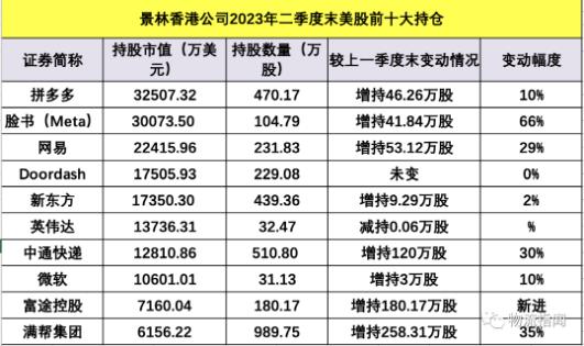 近日,景林資産的海外子公司景林資産管理香港有限公司(GREENWOODS ASSET MANAGEMENT HONG KONG LTD)向美國證監會提交瞭(le)截至2023年二季度末的美股持倉數據(13F文件)。報(bào)告期内,其美股持倉總市值20.69億美元(約合人民币149.76億元),環比增幅約20%。