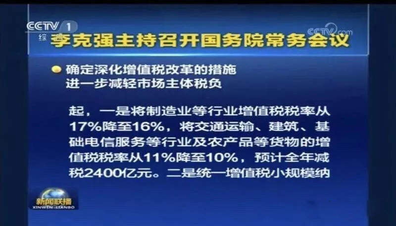 會議指出,過去五年通過實施營改增累計減稅2.1萬億元。按照黨中央、國務院部署,爲進一步完善稅制,支持制造業、小微企業等實體經濟發展,持續爲市場(chǎng)主體減負,會議決定,從2018年5月1日起,一是将制造業等行業增值稅稅率從17%降至16%,将交通運輸、建築、基礎電信服務等行業及農産(chǎn)品等貨物的增值稅稅率從11%降至10%,預計全年可減稅2400億元。