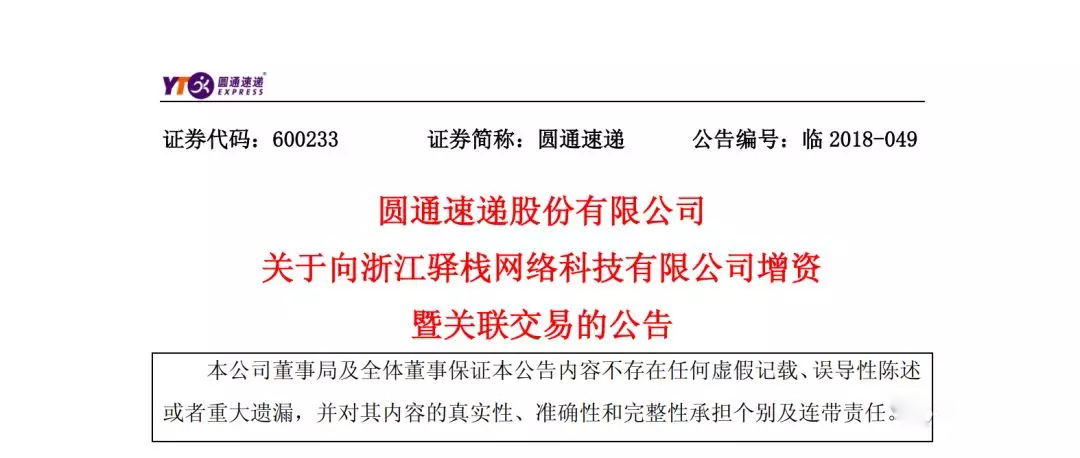 根據公告,圓通拟以自有資金4.5億元人民币對(duì)浙江驿棧進行增資,其中1575萬元人民币認繳新增注冊(cè)資本,4.3425億元人民币計入資本公積金。本次投資後,公司将持有浙江驿棧1575萬元人民币注冊(cè)資本,持股占增資完成後(hòu)比例爲6.28%。