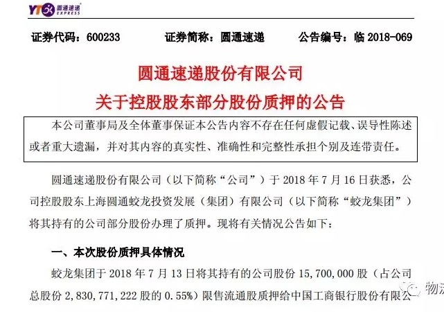 7月17日,圓通速遞發布關於(yú)控股股東部分股份質押的公告。公告顯示,公司控股股東上海圓通蛟龍投資發展(集團)有限公司(以下簡稱“蛟龍集團”)将其持有的公司部分股份辦理瞭(le)質押。