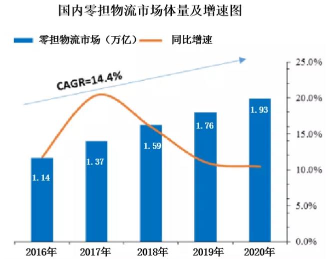 專家預測(cè),到2020年,零擔物流(即專線物流)行業市場(chǎng)體量将達到近2萬億元。從2016年開始,整個市場(chǎng)都在以10%以上的速度在增長(zhǎng),發(fā)展前景十分廣闊。